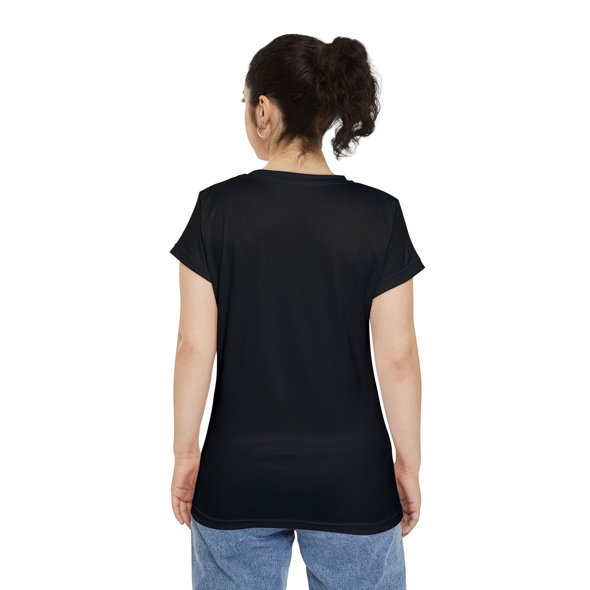black mindful tee usa, breathable quick dry t-shirt, wrinkle resistant polyester spandex top, capsule wardrobe basic, women’s yoga lounge wear, minimalist active tee, timeless black performance shirt.