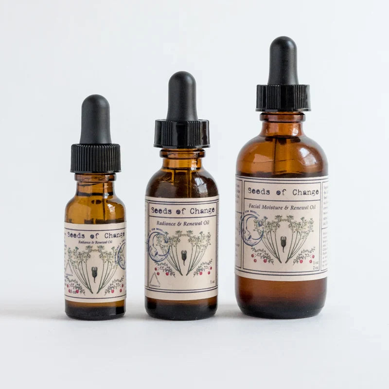 Botanical renewal oil for hardened, sun-damaged, wrinkled, scarred and mature skin. Appropriate for use on face and body. These antioxidant oils pressed from organic seeds help to renew the skin’s surface by encouraging cellular turnover, sloughing off damaged skin cells and promoting an antioxidant response element (A.R.E.) in the skin. High levels of healthy fatty acids improve over-active inflammatory actions, leaving skin radiant.
