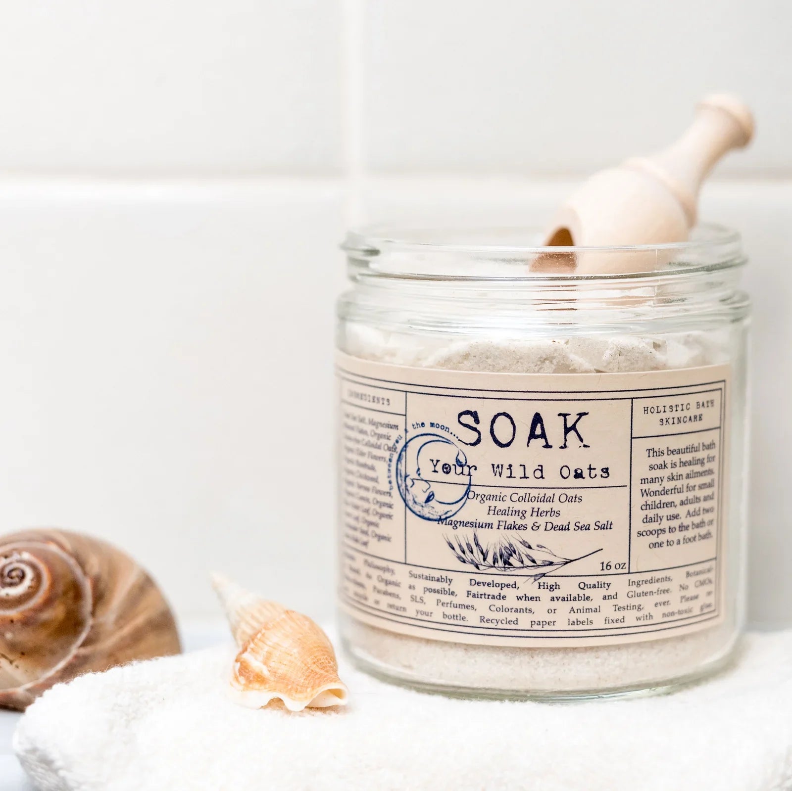 Organic colloidal oats, healing herbs, magnesium flakes & Dead Sea salt.